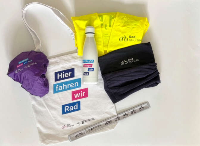 - Der Umfang der Pakete ist innerhalb der gewählten Paketgröße identisch: Baumwollbeutel, Warnweste Schlauchschal und Schnappband im Design der RadKULTUR, ein individualisierter Artikel (Sattelüberzug oder Trinkflasche zur Wahl), Informationsflyer mit Reflektorstickern, personalisiertes Anschreiben